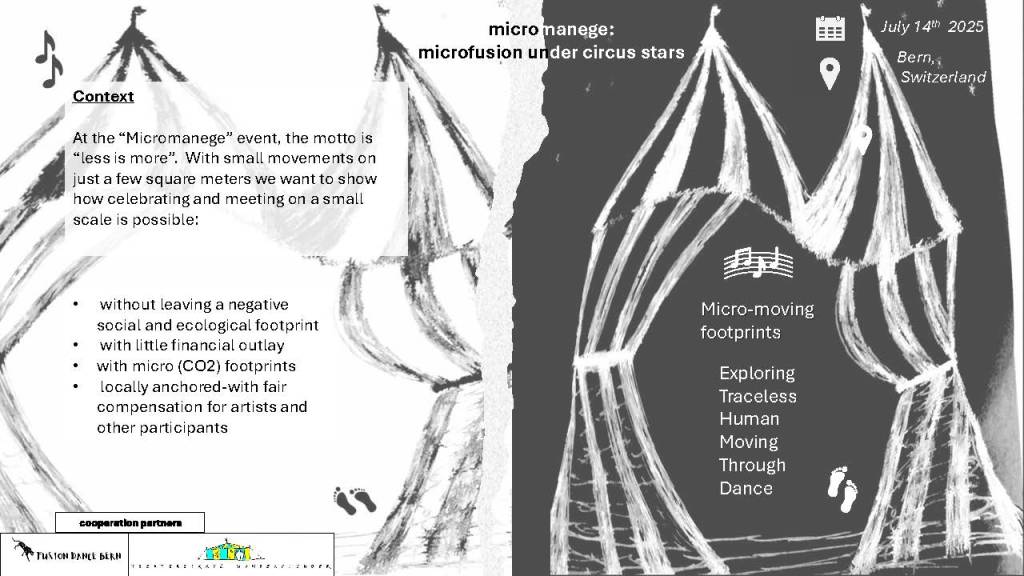 Beyond a celebration of the beauty of micromovements, we also connected the motto “less is more” to questions of sustainability and socioecological justice. By creating a best-practice example for traceless celebration and dancing, we considered strategic, social, ecological aspects as well as aspects of local embeddedness in our event organisation (as illustrated in the graphic above). We ensured the support of local artists including fair financial compensation for everybody who essentially contributed to the event. Another aspect of local embeddedness was the use of the already existing local infrastructure of our cooperation partner “Circus Wunderplunder”. We further ensured collaboration and possibilities for participation for the local dancing community, particularly FusionDance Bern.