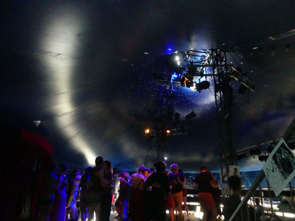 A group 50-60 people dancing on a very tiny circus stage to the tunes of a female vocalist with her loop station. Not only is the stage tiny, but also the movements of the dancing people are attuned to the reduced space that they have.